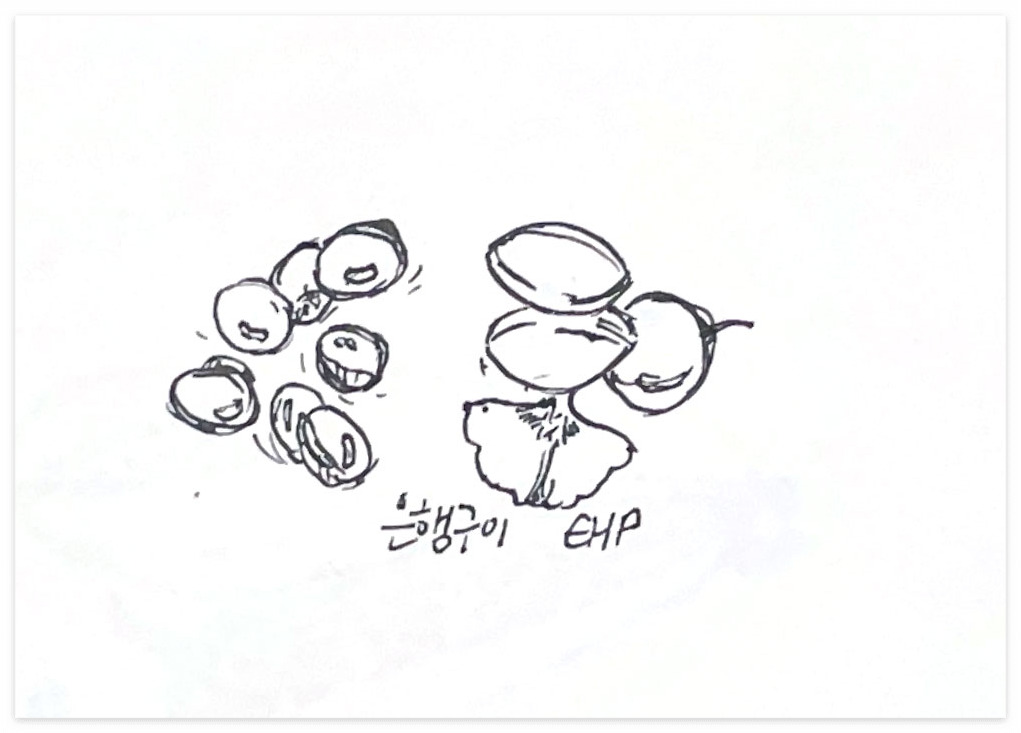 은행은 약성과 독성이 있어 한꺼번에 일정량 이상 먹으면 탈이 난다는 것을 그때는 몰랐다. 할머니는 과연 몰랐는지 의문이다. 가끔 할아버지가 먹고 싶다고 하면 개수를 세어가며 예쁜 접시에 몇 알만 담아가던 기억이 있기 때문이다. 여하튼 나는 철마다 과자 대신 은행을 먹으며 탈이 났고 그 이후로 더이상 은행의 고소함보다 꼬린내를 더 강하게 떠올리게 되었다. 그리고 지금은 삼게탕 안에 들어간 은행 단 한 알도 먹지 않고 남기는 어른이 되었다.