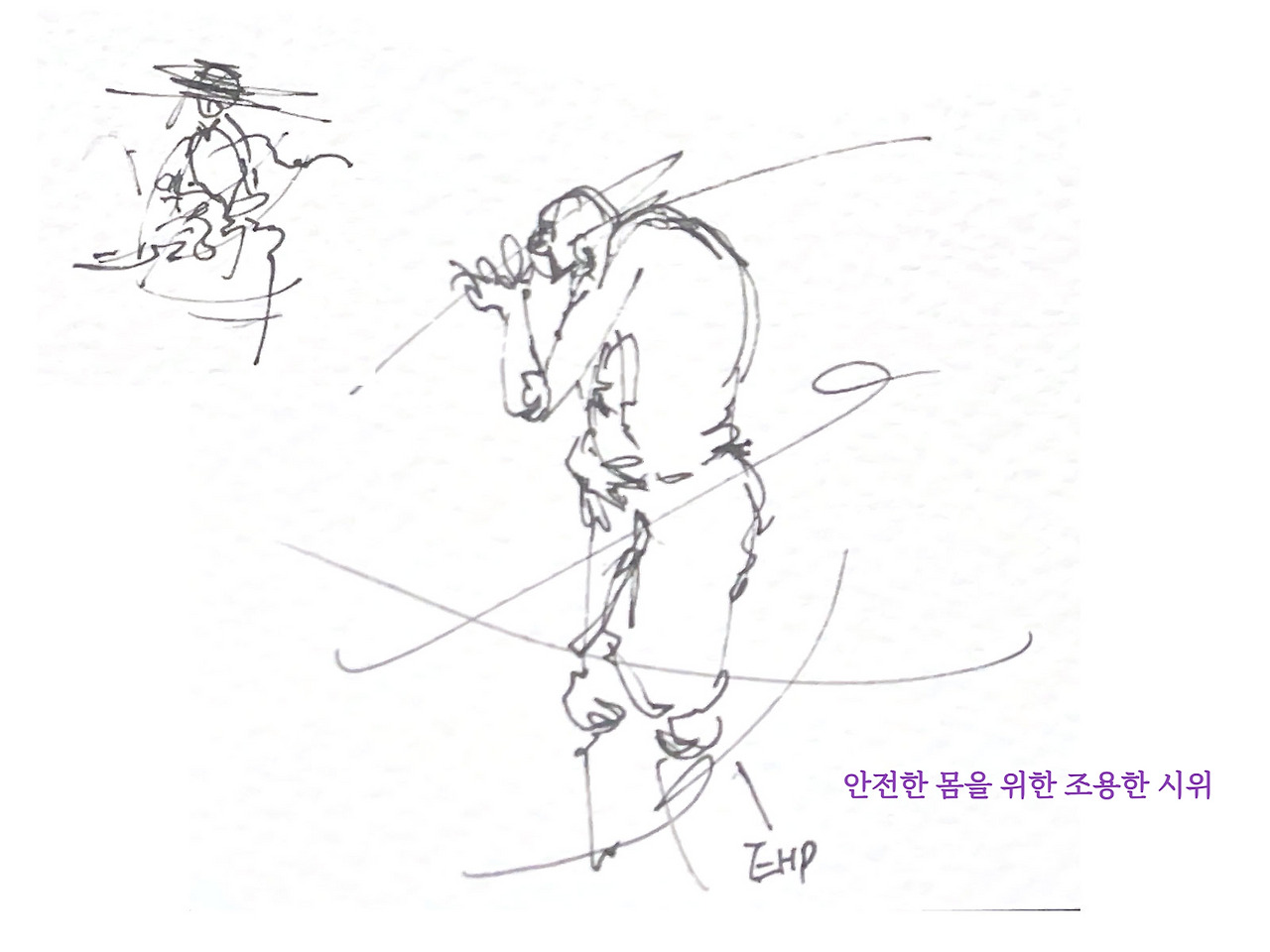 저는 이것을 트레이닝 또는「자기 보호 놀이방법」으로 확장시켰습니다. 이 안전 놀이는 가까운 거리에서 보면 알아차리기 힘든 순간의 포착이지만 조금 더 확장된 행위로 바라볼 수도 있습니다. 예를 들어, 작은 고갯짓은 에어팟의 소리를 들으며 리듬을 타는 행동으로 보일 수 있겠지요. 고갯짓이 리듬으로 그리고 춤으로 확장되어 가면서 저를 안전하다는 감각으로 이끌거나 '안전한 내가 하는 행동'으로 확장됩니다.