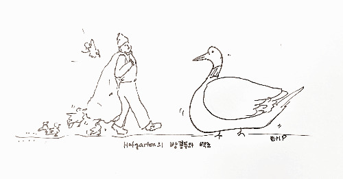 심지어 자루에 담긴 빵은 하루 뒤 아침에 공원의 새들에게 뿌려진다. 공원과 호수의 환경 담당자는 하루 전날의 빵이 담긴 빵자루를 들고 새벽에 등장한다. 벌써부터 오리나 거위, 비둘기, 갈매기들이 빵자루를 쪼아대며 뒤따르는 모습은 정말로 어느 유럽 전래동화에 등장하는 장면 같다. 졸린 눈으로 적당한 자리에 자리 잡은 담당자가 빵자루를 열어 전날의 빵을 아무렇게 뜯어 뚜리면 이름 모를 새들이 달라붙어 빵을 쪼아 먹었다. 덕분에 호수에 살던 백조는 <백조의 호수> 발레에는 절대 등장할 수 없을 만큼 육중하고 비대해져 있었다.