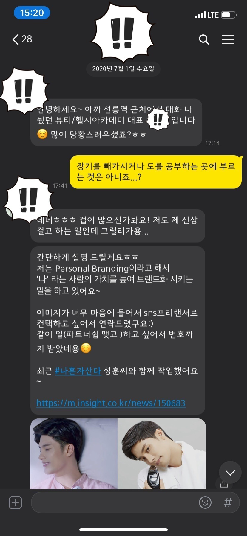 아 이때 알아차려야 했습니다. 정말 저를 모델로 섭외하려고 했다면 정확한 회사 정보와 명함 등등을 보내줬을 텐데 말이죠. 아무튼 눈에 콩깍지가 씌어서 저는 저 카톡을 보고 ‘아 뭐야. 나 이제 성훈이랑 같이 일하는 건가? 훗.‘ 하는 생각밖에 들지 않았죠. 아무튼 그렇게 오프라인 미팅 날짜를 잡았습니다.