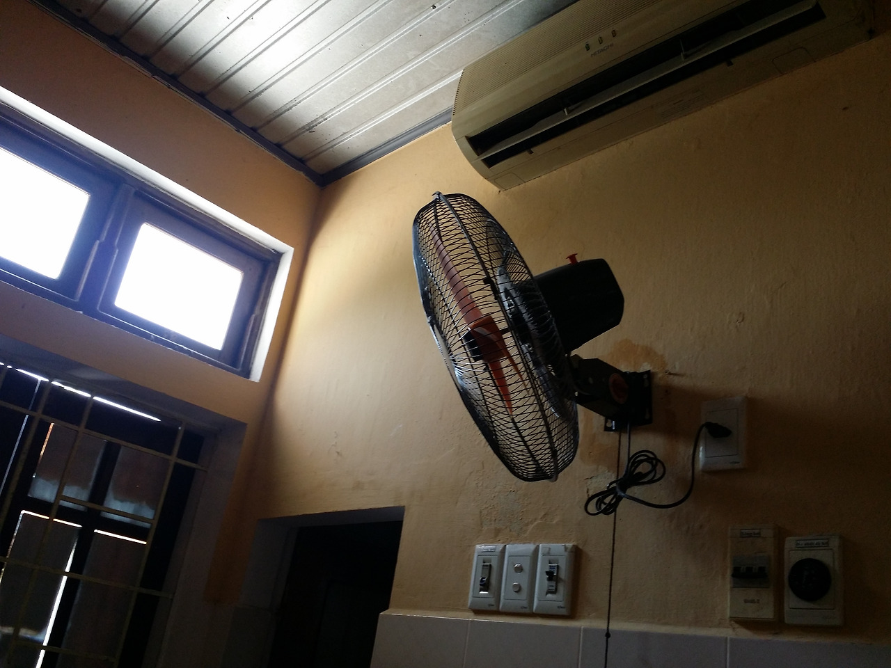 벽에 얼룩도 있고, 선풍기, 에어컨은 정말 낡았다.