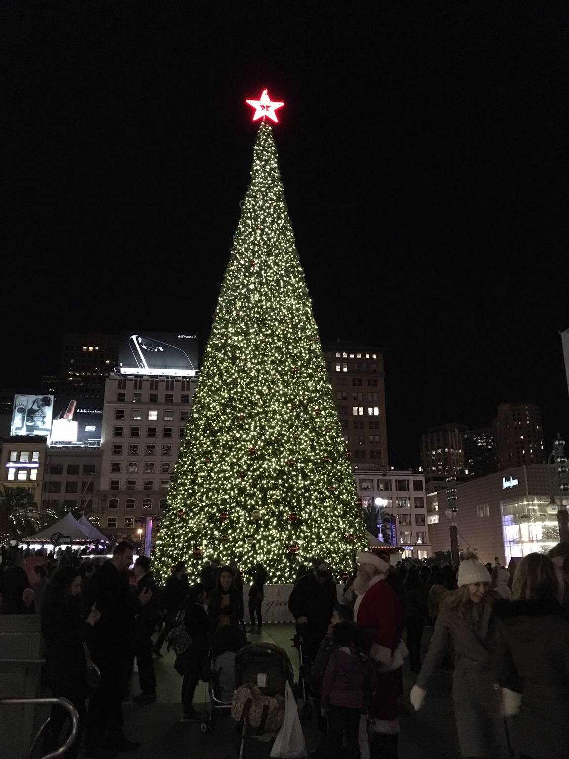 중앙에 큰 크리스마스 트리가 세워져 있고 사람들이 엄청나게 바글바글 몰려있다.