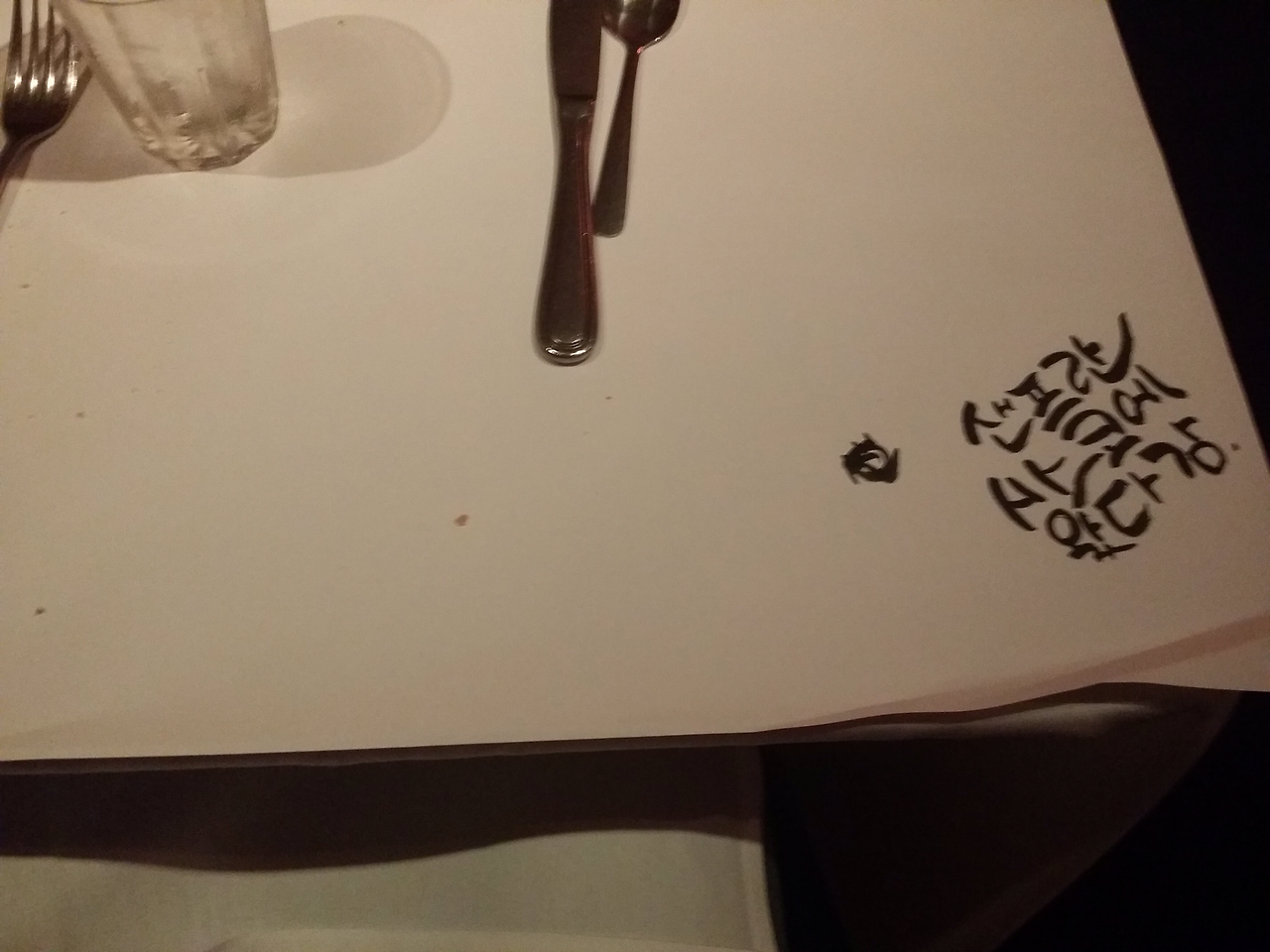 음식이 나오기까지 시간이 오래 걸려 종이로 된 식탁보에 기록을 남겼다.