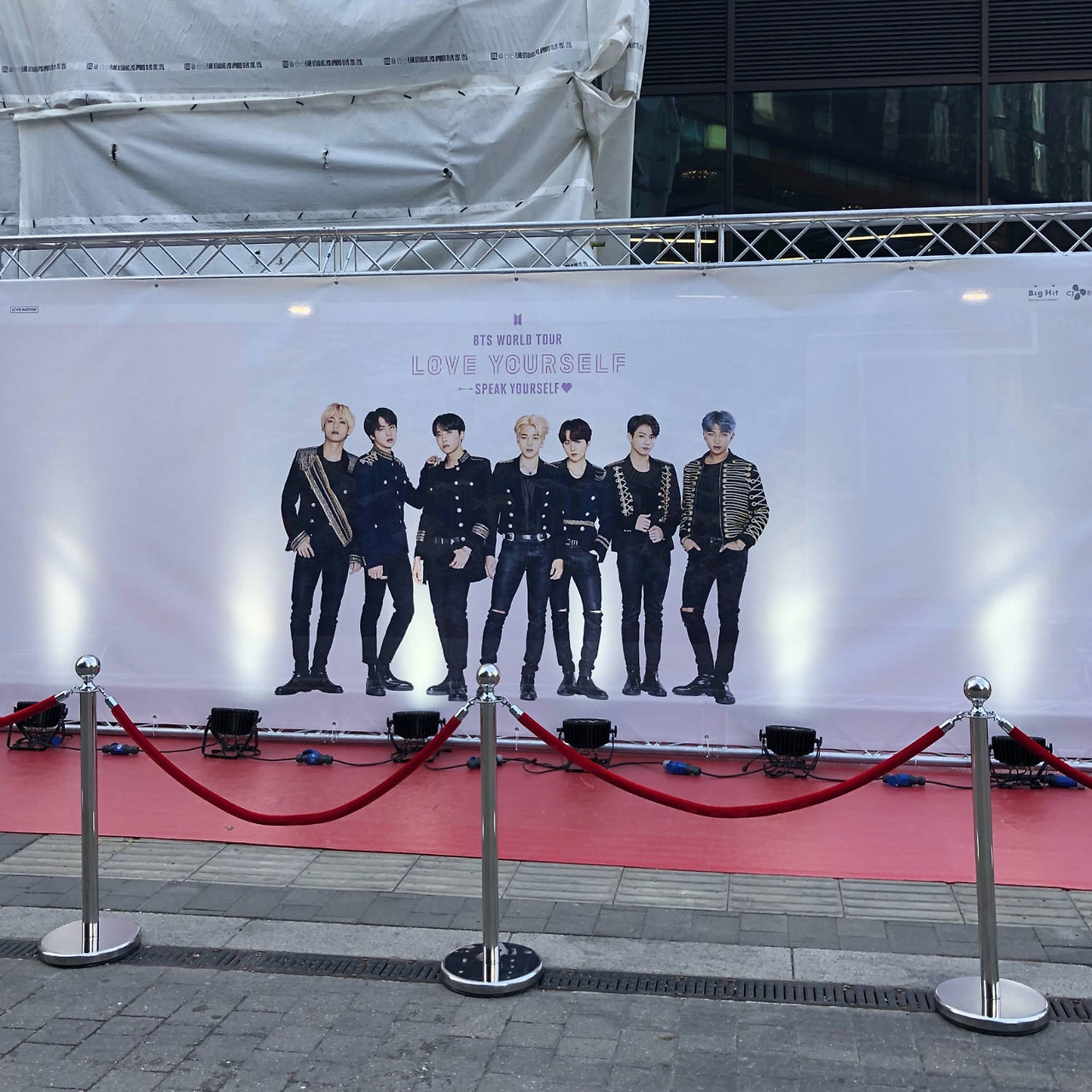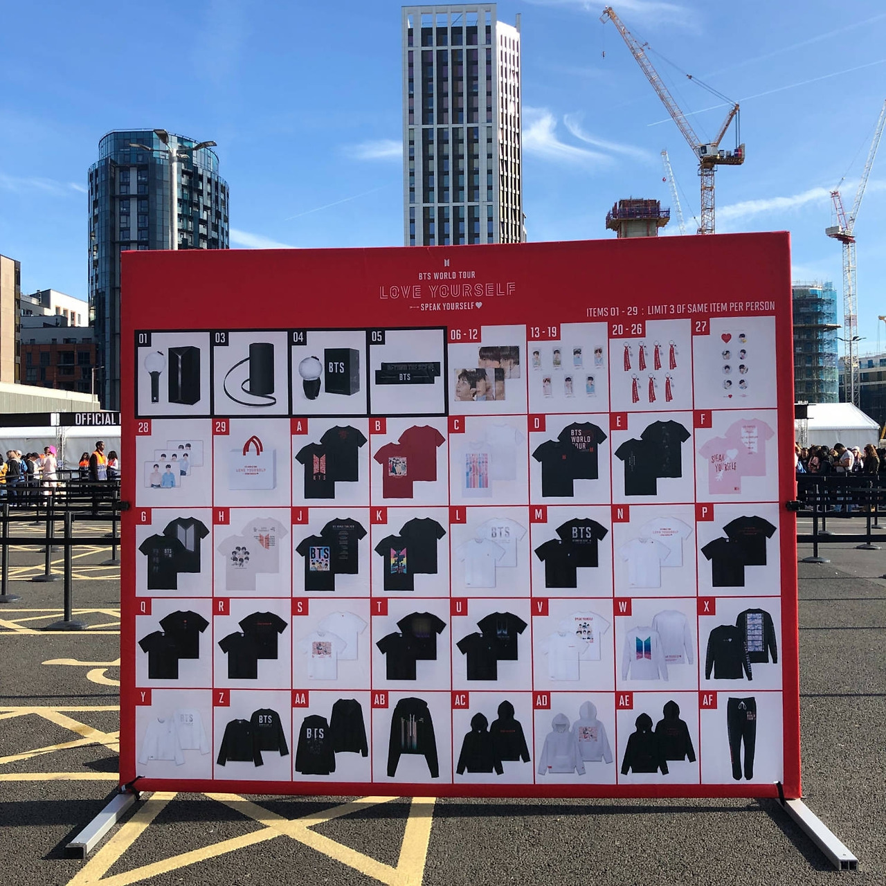 늘 야매 덕질, 야매 아미를 자청하므로 이번에도 몇 가지 정보를 런던에 도착해서야 알았다. 투어 굿즈를 금요일부터 팔기 시작하고 팝업 스토어가 런던 시내에 두 종류(BT21과 방탄 공식)나 있다는 것을 포함하여. 나는 투어 굿즈가 중요해서 팝업 스토어는 별로 흥미가 없었지만, 투어 굿즈를 금요일부터 팔기 시작했고 금요일에 줄이 거의 없었다는 정보에는 바로 별표를 쳤다. 도대체 토요일에 언제부터 줄을 서야 할 것인가! 공연 티켓이 있는 사람들 중에 금요일에 먼저 굿즈를 산 사람들이 얼마나 될까!! 물건은 전부 있었을까!!!