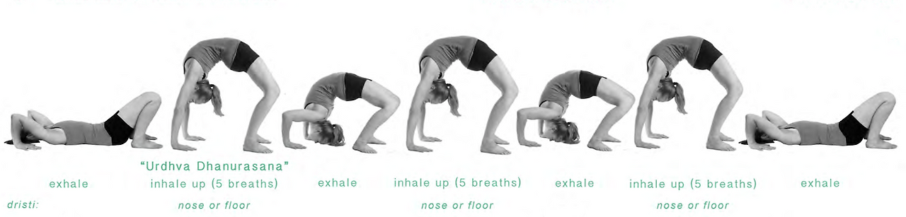 한국에서 손과 발 사이가 멀다는 이야기를 듣고 왔기 때문에 막연히 허리가 더 많이 접혀야 한다고만 생각했고 자연스럽게 백밴딩에 대해 생각하기 시작했다. 보통 백밴딩은 세 번 하는데(위에 사진처럼) 우리 요가원에서는 다섯 번씩 시킨다. 두세 달 전만 해도 나는 세 번에서 네 번으로 딱 하나 늘리는 게 너무너무 힘들어서 포기하곤 했다. 이런 이야기를 선생님한테 했을 때 허리의 유연성보다도 다섯 번 들 수 있는 힘을 기르는 것이 먼저라면서 우선 다섯 번을 채우려고 노력해보라는 이야기를 들었다. 이때부터 허리를 하드코어하게 쓰는 동작들을 나의 팔과 다리 힘의 문제로 느끼기 시작한 것 같다.