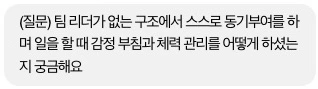 감정 부침은 저도 아직 뾰족한 수가 없는데요. 만약에 업무를 하면서 사람하고 문제가 있으면 EM과 상담하면서 현실적으로 해결하려고 해요. 그리고 운동하면서 멘탈관리에 도움을 많이 받았고 특히 거기서 느끼는 성취감이 중요했다고 생각합니다. 저는 일을 하면서 자아실현이나 성장하는 나를 계속 기대하다 보니까 감정적으로 상황을 힘들게 받아들이는 것 같은데, 일 밖에서 성취감이 약간이나마 채워지니까 일을 건조하게 ‘일'로만 볼 수 있게 되더라고요. 직업에 열정이나 애착을 갖지 말자는 이야기는 아니고, 필요할 때 on/off를 할 수 있게 되었다는 뜻이에요!