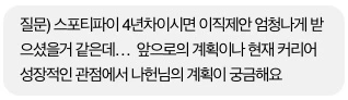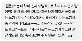 많은 분들이 비슷한 고민을 할 것 같아요. 일에서 내 취향을 깊게 생각하는 시간이 필요하다고 생각해요. 그냥 돈 벌어야 하니까 하는 것 같아도 미묘하게 호불호가 있는데, 그런 것을 알아차리기 시작하다 보면 앞으로 무슨 일을 하고 싶은지 아이디어가 생기지 않을까요?