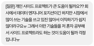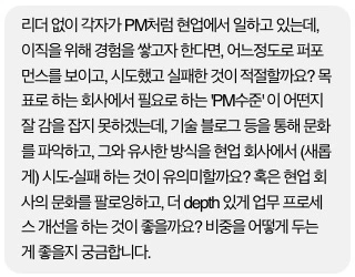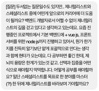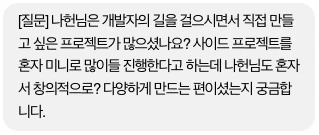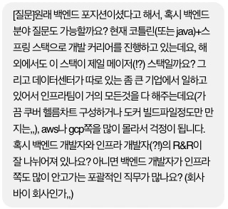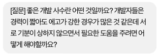 아래 QnA를 읽어주시기 전에 - 저는 아직 경력 10년도 채우지 않았고 주변 네트워크도 넓지 않은 변방�의 직업=개발자인 사람이랍니다. 꼭 염두에 두고 읽어주세요. 또 몇 개를 읽어보면 느끼시겠지만 저는 커리어는 스토리텔링이지 왕도가 없다고 생각하는 편이에요. 그러니까 아래 내용에 커리어 A-Z 방법론은 없습니다. 마지막으로 틀린 내용은 댓글이나 프로필 화면의 제안하기를 통해 알려주시면 정정하겠습니다.