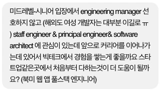 그리고 개발자 시장이 같이 나이를 들어가면서 자연스럽게 시니어들이 자리 잡을 것이라고 생각해요. 지금이야 연차가 차면 높은 한 자리하거나 매니저가 돼야 한다고 말하지만, 점점 연차가 많아도 계속 개발자로 남을 수 있게 커리어 스텝도 다양해지지 않을까요.
