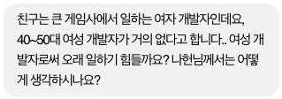 저는 개인적으로 40대 여성 개발자를 만난 적이 없어요. 흠 예전에 저와 같이 일하셨던 분들이 이제 30대 후반 아니면 막 40대가 되셨을지도 모르겠어요. 선례가 없으면 우리가 만들면 되지 않을까요?