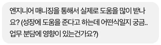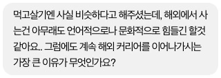 아직 지금 다니는 회사에서 배울 점이 있고 한국에 들어가야 하는 중요한 이유가 없기 때문이에요.