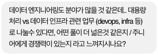 혹시 이걸 데이터 파이프라인을 구현하는 업무를 말씀하시는 것이라면, 이건 취향 차이 같아요. 데이터 파이프라인도 비지니스에 따라서 여느 복잡한 백엔드 서비스처럼 코드가 굉장히 복잡해질 수 있거든요. 이런 빡세게 복잡한 일을 좋아하는 사람이 있는 반면, 인프라 같은 일을 좋아하는 사람이 있더라고요. 여기는 또 다른 스타일의 복잡함이 있으니까….