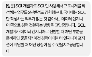 제가 말씀하신 업무를 전문적으로 해본 적은 없지만, SQL procedure는 요즘 쓰는 방식에 비해서 운영이 힘들어서 많이 쓰지 않는 것으로 알고 있어요. 데이터 엔지니어로 바꾸신다면 지금 쓰는 개념들이 여기저기 녹아있는 것을 보시게 될 것 같아요. 아주 큰 테이블에 쓰는 쿼리를 최적화해보신 적이 있다면 경험으로 어필하는데 도움이 될 것 같습니다.