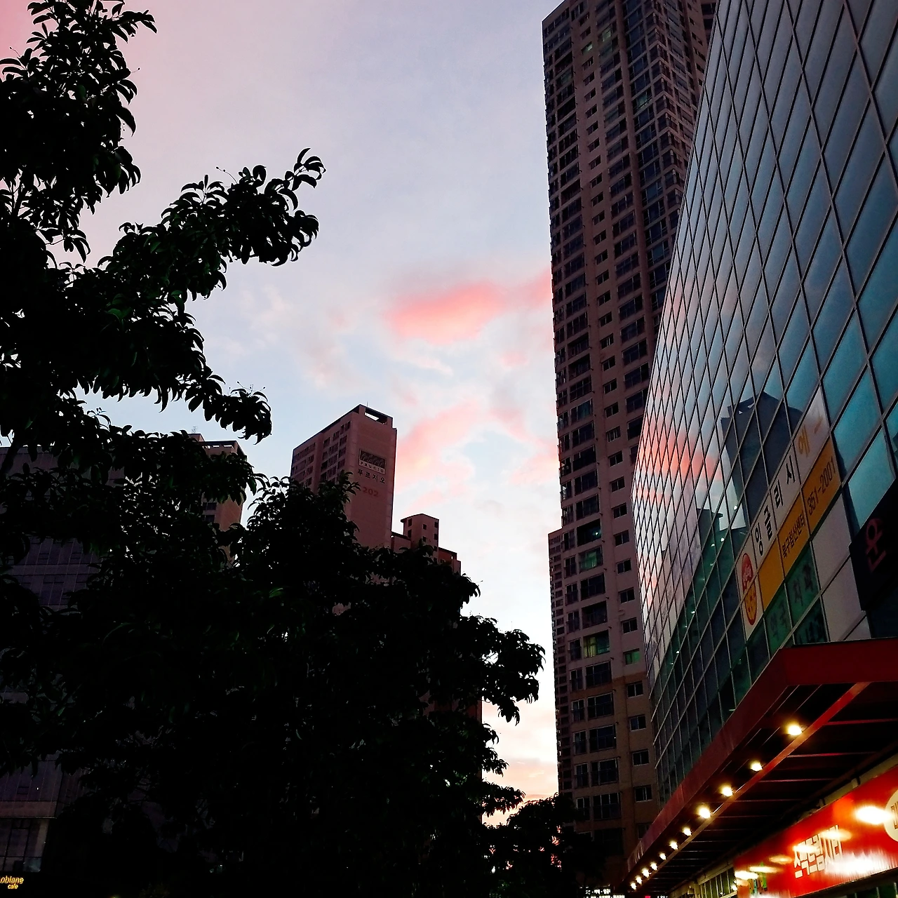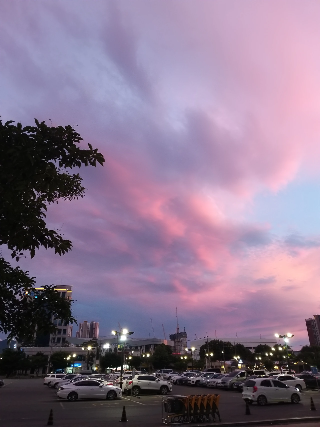 전나무 군락을 초토화시키는 왜가리 떼의 울부짖음을 뒤로하고 부지런히 발을 움직이다 보면, 서쪽 하늘의 얼굴이 이내 나타난다. 매일 비슷한 시각에 만나게 되는 얼굴이건만, 신기하게도 똑같은 표정을 본적이 한 번도 없는 것 같다. 어느 날은 맑디 맑은 아이의 웃음을 보여주다가 요즘처럼 우기의 검은 먹구름으로 가득 차 있을 땐, 악마의 눈꼬리를 닮아있어 은근히 미움을 싸기도 한다. 한판의 변검 공연을 보는 듯 그 짧은 순간에도 그야말로 변화무쌍이다.
