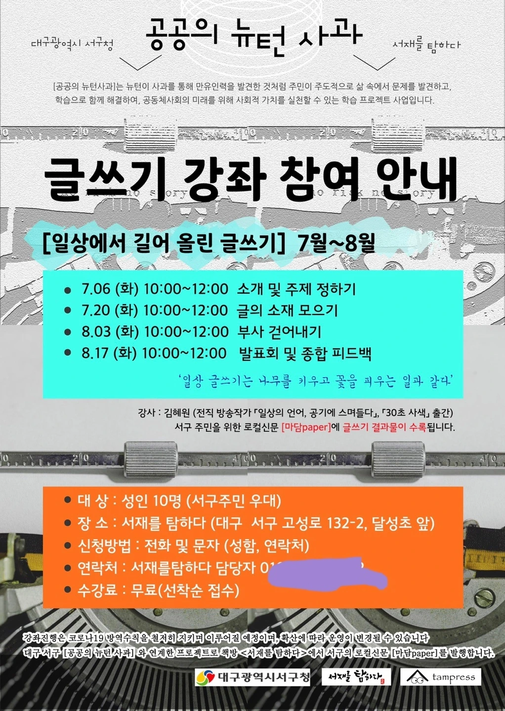 프로젝트 명은 '공공의 뉴턴 사과 프로젝트', 강좌명은 '일상에서 길어 올린 글쓰기'로 정해졌다. 매일같이 생방송에 나갈 원고를 쓴 라디오 방송작가만큼 일상 글쓰기를 전하기에 적합한 인물은 없다고 생각한다. 반복되는 일상을 어떻게든 다른 시선으로 보고 글을 엮어냈던 수십 년의 내공은, 비록 어깨를 한껏 들썩거리거나 엄지 손가락 두 개를 당당히 척, 하며 내세울 만큼은 아니어도, 머리와 가슴이 기억하는 '쓰기의 힘'으로, 그 동력을 제공할 잔근육으로 자리하고 있을 터이다. 그래서 가르치는 일을 두려워하지는 않았던 거 같다. 현업을 유지하고 있을 때도 종종 특강으로 강단에 서곤 했으니까.