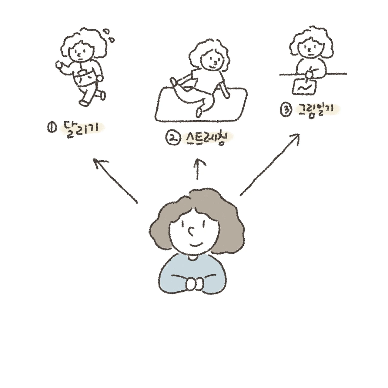 '30분 달리기를 하고, 유튜브를 보며 스트레칭을 따라한 뒤, 자기 전에 그림을 그리는 것.'