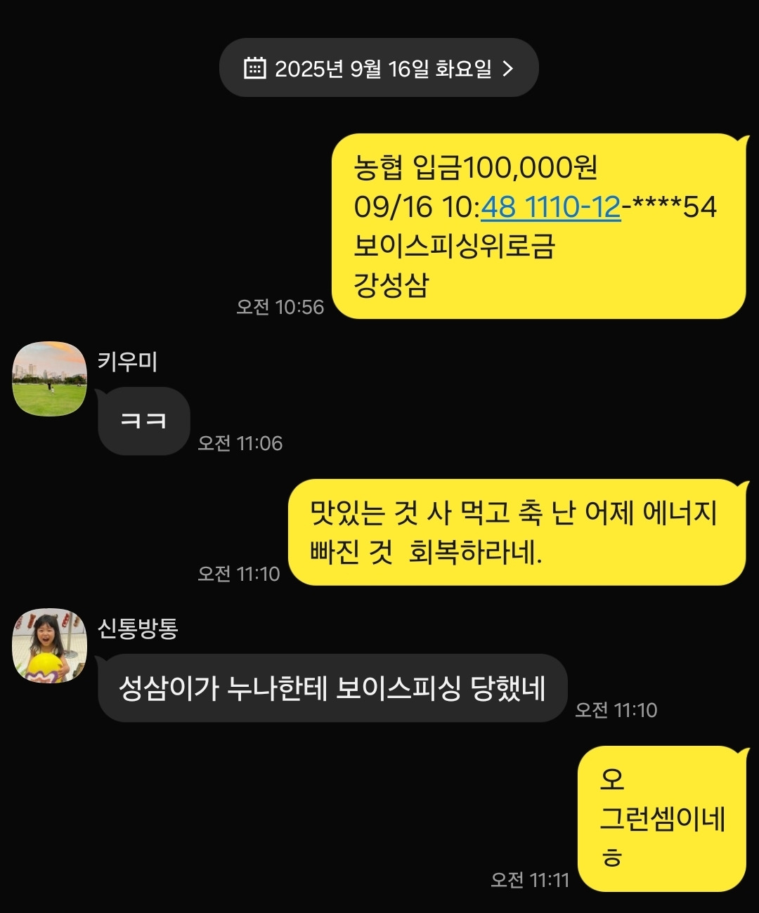 피해를 당하지는 않았지만 나의 수치를 드러내서 보여주고픈 대상이 있다. 우리 아들과 딸, 그리고 내 막냇동생이다. 감정이 다소 가라앉았을 즈음 막냇동생이랑 통화를 하였다. 잠시 후 문자 알림이 왔다. '보이스피싱위로금'이라는 글자가 새겨져 있었다. 한 유머하는 신통방통(남편)의 반응에서 빵 터졌다.