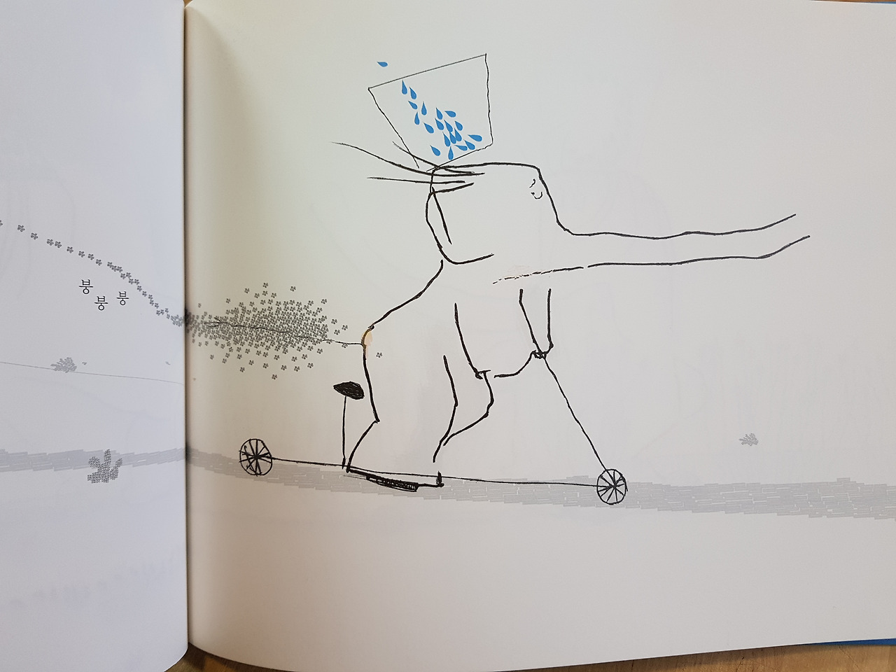 그저 <코끼리 아저씨와 100개의 물방울>을 보며, 코끼리 아저씨의 그 큰 눈에서 하늘빛 눈물이 주르륵 흐르는 노인경 작가의 그림을 보며 가슴이 먹먹해져 옴을 느낄 뿐입니다.