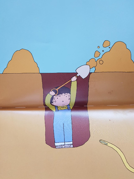 구덩이라는 우리말 단어로 표현했는데 너무나 딱! 와닿는 단어라 그림책을 번역하시는 분들의 어휘력에 다시 한번 놀랍습니다. ('구멍'과는 정말 다르지요.)