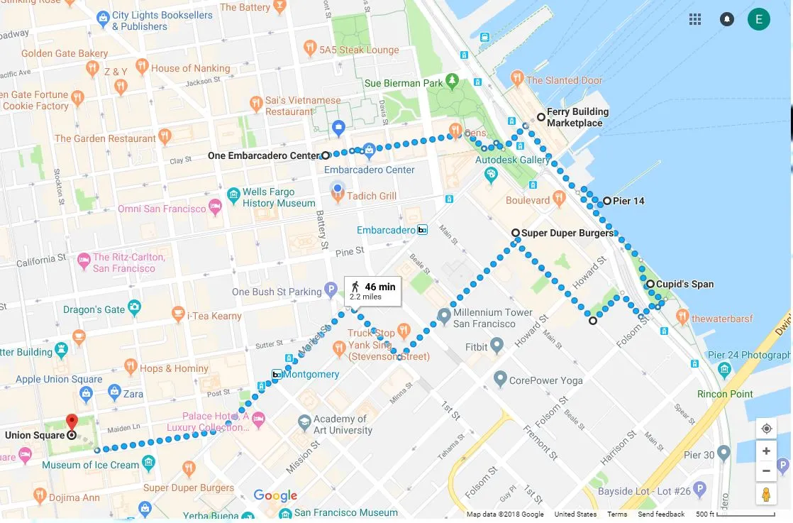1) Financial District/Ferry Building – 2) Embarcadero/Pier 14/Cupid's Span - 3)Super Duper Burger – 4) Union Square (Cable car/Shopping District) – 5) Lombard – 6) Ghirardelli Square – 7) Treasure Island