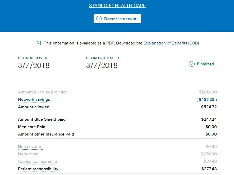 위 내역을 보면 $277.48은 바로 내 연간 디덕터블인 $250과 그 이후의 코페이인 $27.48을 포함하고 있는 것을 알 수가 있다. 이 디덕터블 금액이 낮을수록 매년 내야 하는 의료보험 프리미엄이 비싸지게 된다. 풀어서 얘기하면 매년 $250불을 써야지 보험 혜택을 누릴 수 있는 것이므로, 디덕터블이 낮다면 병원을 자주 찾을수록 유리한 것이다. 반대로 연중 병원을 거의 찾지 않는 사람들은 어차피 지정된 디덕터블의 액수에 도달하지 못하기가 쉽기 때문에 아무래도 디덕터블이 높은(High deductible) 의료보험이 유리할 수 있는 것이 매달 내야 할 프리미엄이 상대적으로 확 낮아지게 된다. 코페이의 경우 디덕터블이 적용되지 않는 기본적인 진단이나 진료내역에 따라 그 액수가 정해져 있는 경우가 많은데 역시 보험에 따라 연단위로 최대 금액이 정해져 있다. 예를 들어 의사를 만나 진료를 받는 코페이는 내 보험의 경우 $20불이고 진료를 10분을 받았던지 1시간을 받았던지 한번 방문에 $20불로 정해져 있다. 그리고 이 코페이는 위에서 말한 $250불 디덕터블과는 따로 작용하는 것이다. (룰이 뭔가 거지같이 복잡하다.)