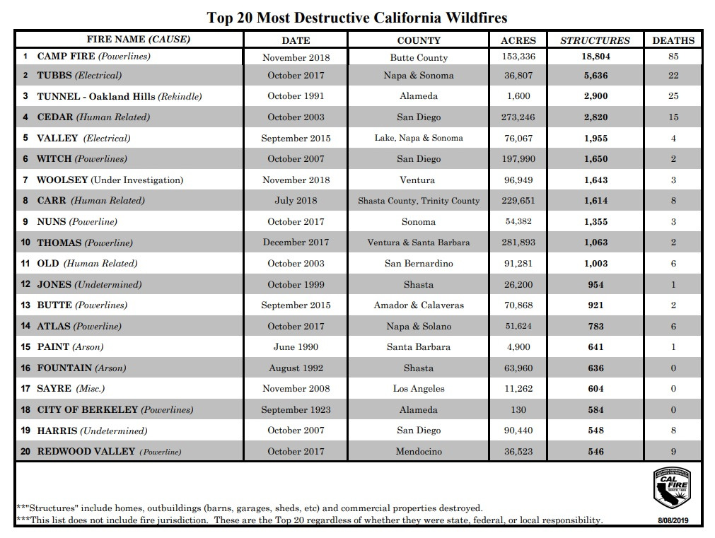캘리포니아에서 발생한 역대 가장 큰 산불 20개 가운데 절반 이상인 10개가 2015년 이후에 발생했다.