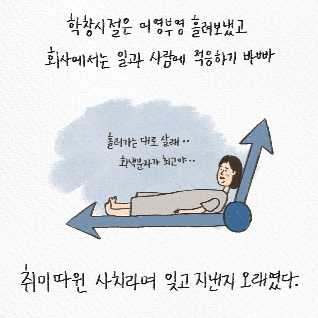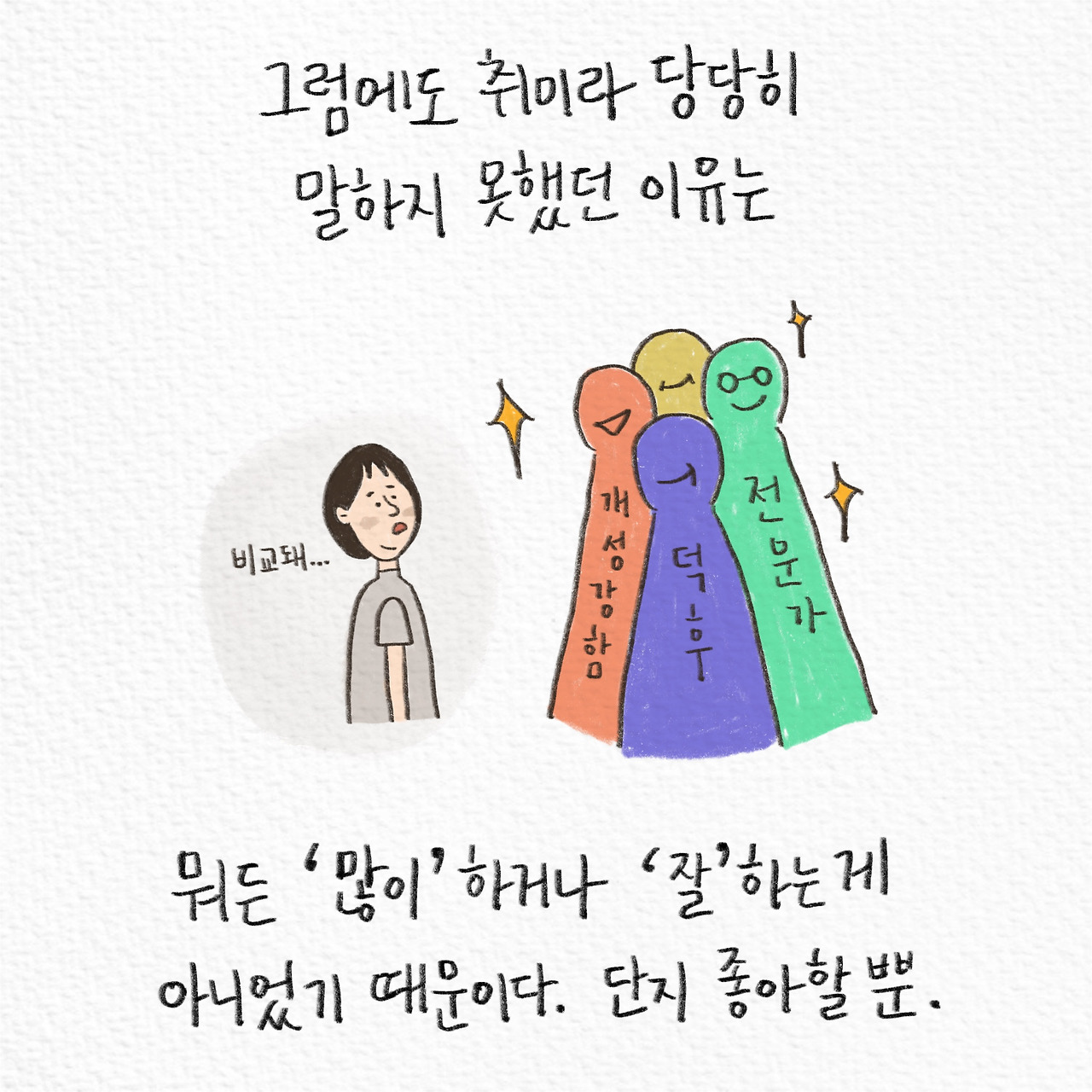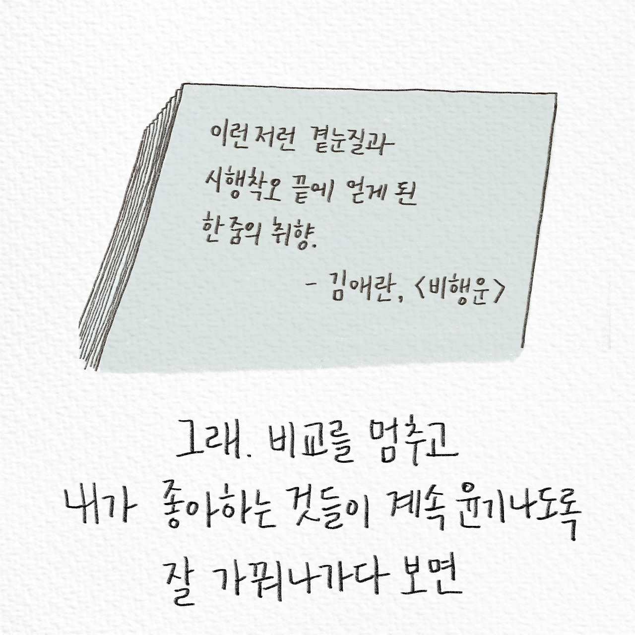 특히 개성이 강한 사람들이 많았던 회사라 더욱 그랬는지도 모른다. 나랑 똑같이 일하고 야근도 하면서 어쩜 저렇게 취미로 자기계발도 하는 걸까. 대체 저 에너지는 어디서 나오는 걸까, 하고 시샘하기도 했던 그때. 그리고 그런 나의 푸념을 따스하게 들어주었던 동료의 몇 마디.