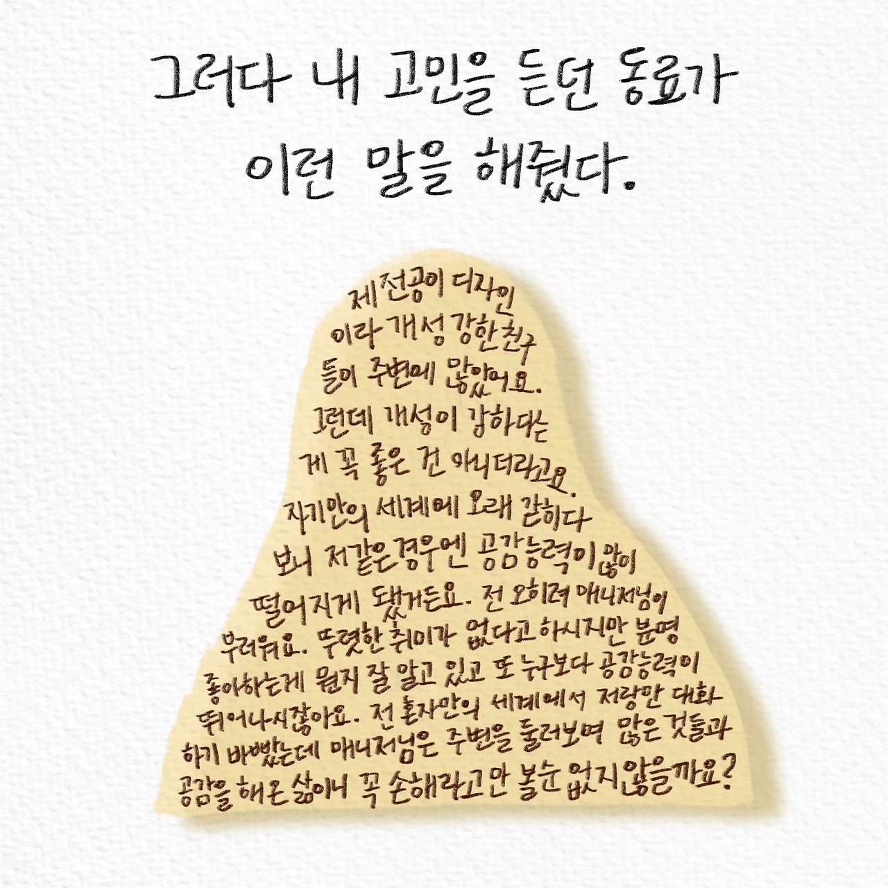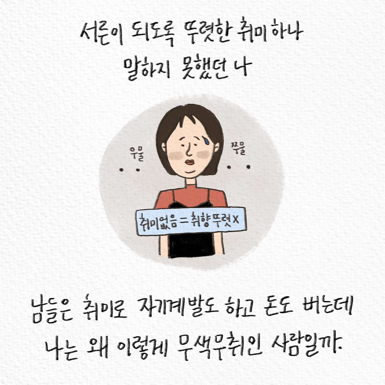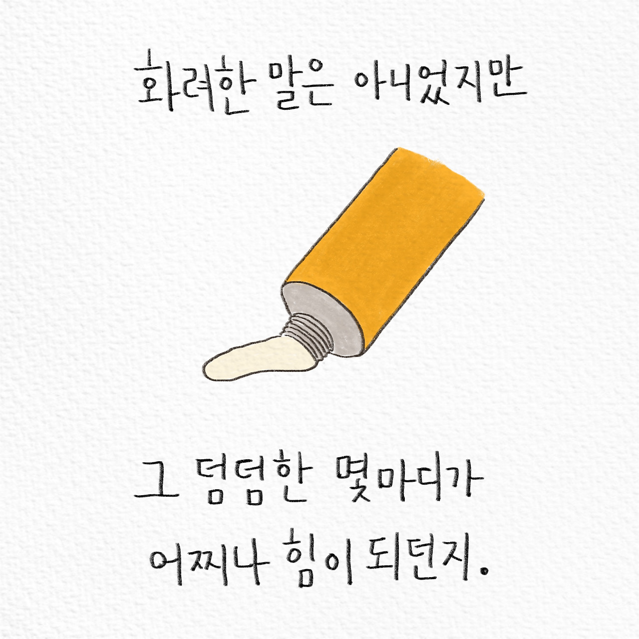 특히 개성이 강한 사람들이 많았던 회사라 더욱 그랬는지도 모른다. 나랑 똑같이 일하고 야근도 하면서 어쩜 저렇게 취미로 자기계발도 하는 걸까. 대체 저 에너지는 어디서 나오는 걸까, 하고 시샘하기도 했던 그때. 그리고 그런 나의 푸념을 따스하게 들어주었던 동료의 몇 마디.