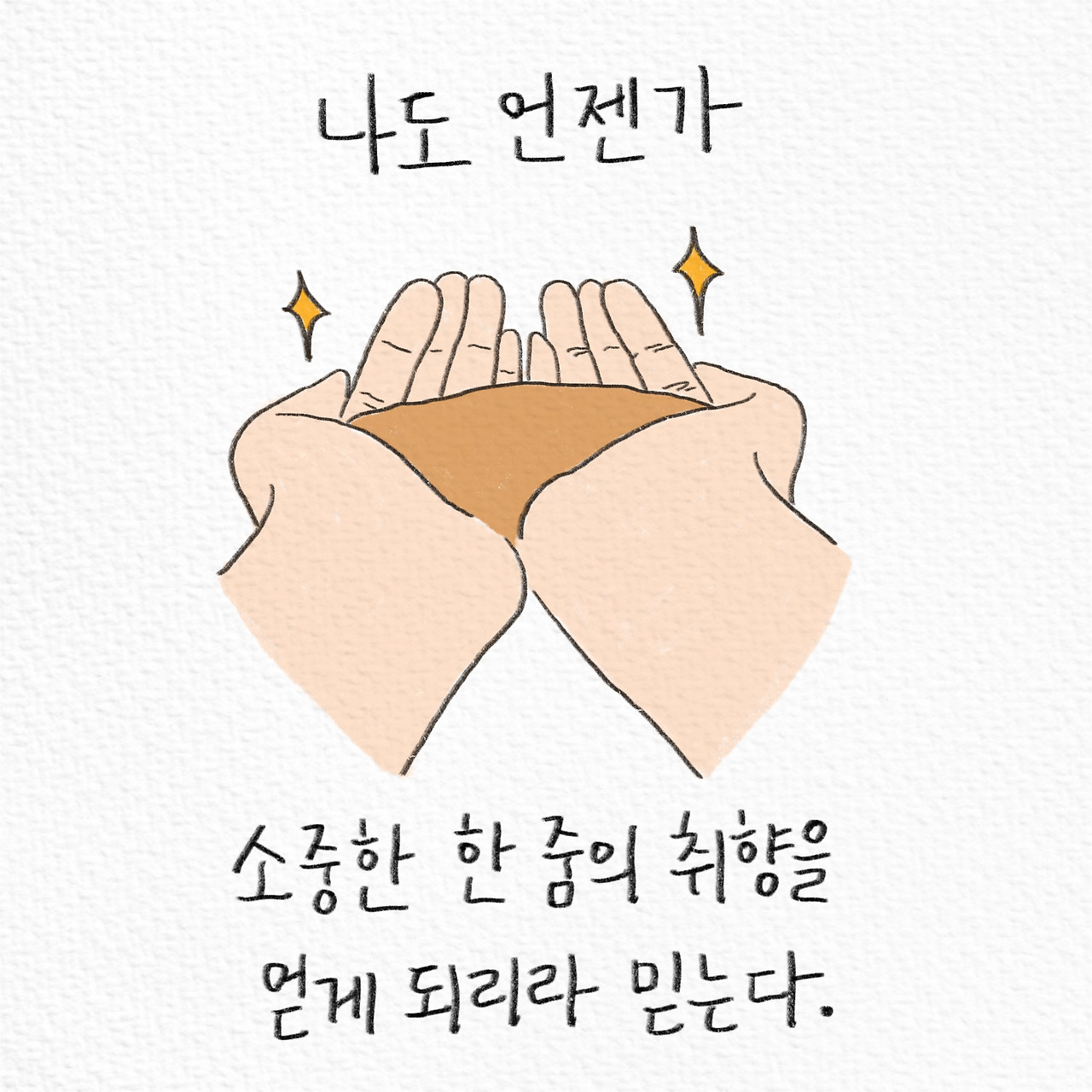 없는 줄 알고 지내왔지만 사실은 방치해두고 있었던 내 소중한 취향들. 비록 뒤늦게 깨달았지만 지금부터라도 내 취향들이 오래오래 윤기날 수 있도록 앞으로 잘 가꿔나가볼 셈이다.