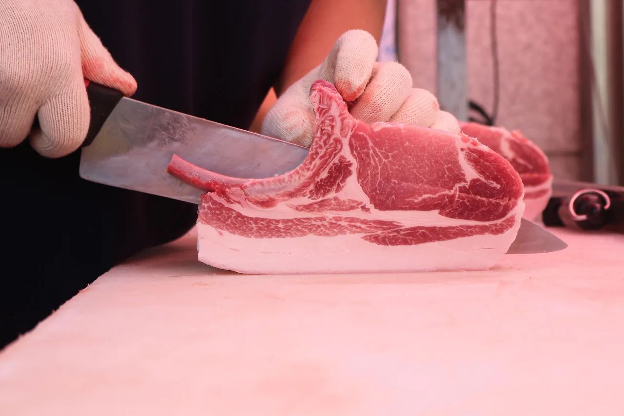 사실 뼈등심은 정육 하는 사람들이 다 알지만, 잘 안 파는 부위입니다. 껍질 벗기고, 기름 치우고 살 발라내려면 포기해야 할 '맛있는 부위'가 너무 많거든요. 뼈등심 부위를 맛있게 팔기 위해선, 돼지고기 스테디셀러인 삼겹살, 새우살을 같이 포함하여 정형해야 하지만, 그렇게 되면 뼈등심에 포함된 삼겹살과 새우살을 따로 팔 수 없다는 아주 어려운 결정을 해야 하는 것입니다.