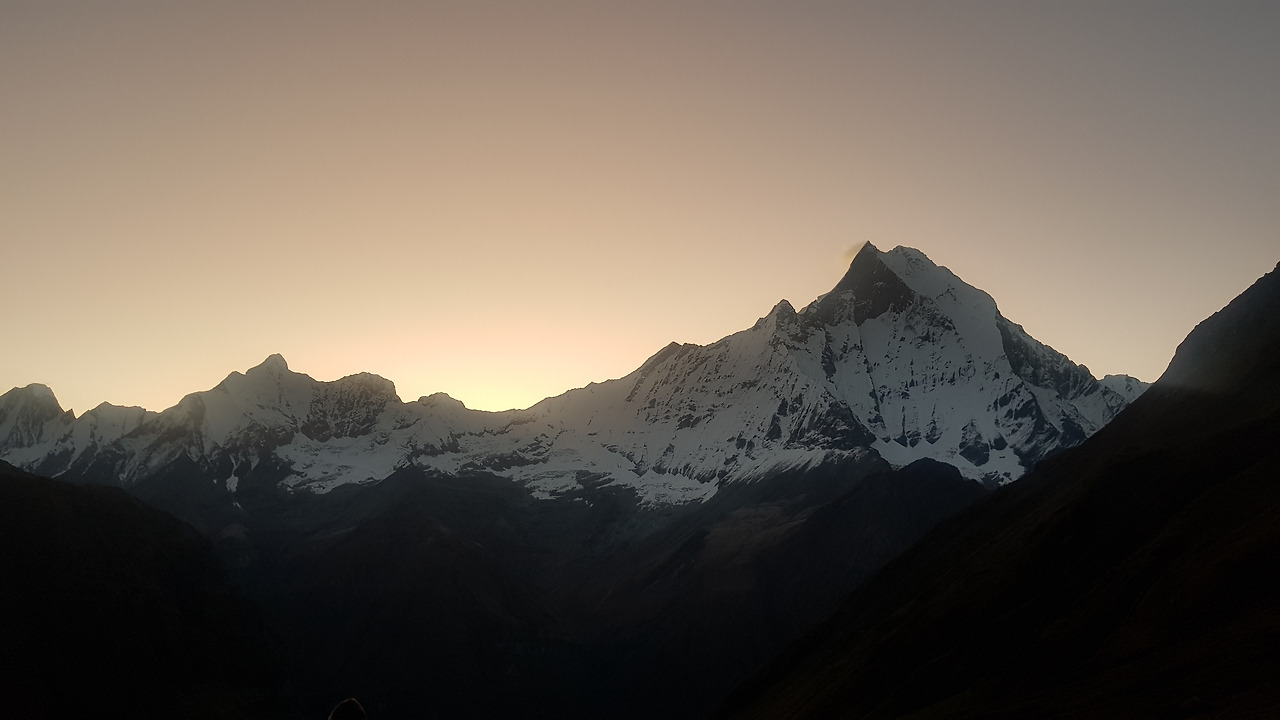 조금씩 동쪽의 마차푸차레의 공제선이 선명해졌다. 시커멓던 하늘은 짙은 남색으로, 청량한 하늘색으로 조금씩 더 밝아왔다. 핵폭발이 주변의 공기를 밀어내듯이, 태양이 떠오르면서 하늘을 수놓던 별들을 지구 밖 어딘가로 내쫓는듯했다. 하늘이 색은 완전히 바뀌고, 마차푸차레는 후광을 가득 담은 채 신비로운 자태를 뽐냈다.