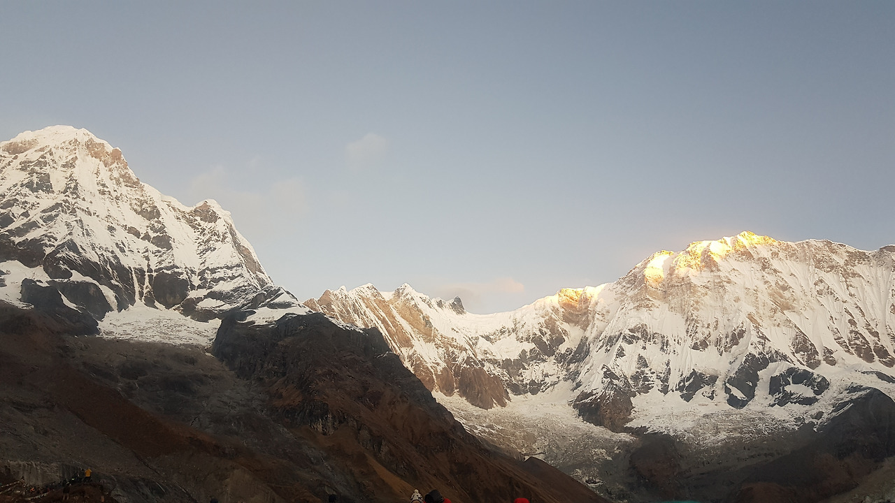 안나푸르나의 진정한 풍경은 바로 일출이었다. ABC를 기준으로 안나푸르나 봉들은 서쪽에 위치해있다. 그래서 일출 시간에 맞춰 이 베이스캠프에 서서 봉우리들을 바라보면, 동쪽인 등 뒤에서 태양이 떠오른다. 그 태양빛을 가장 높은 안나푸르나의 봉우리부터 받아서 황금빛 블라인드가 내려오듯이 안나푸르나 산맥 전체가 붉게 물드는 장관을 볼 수 있다.