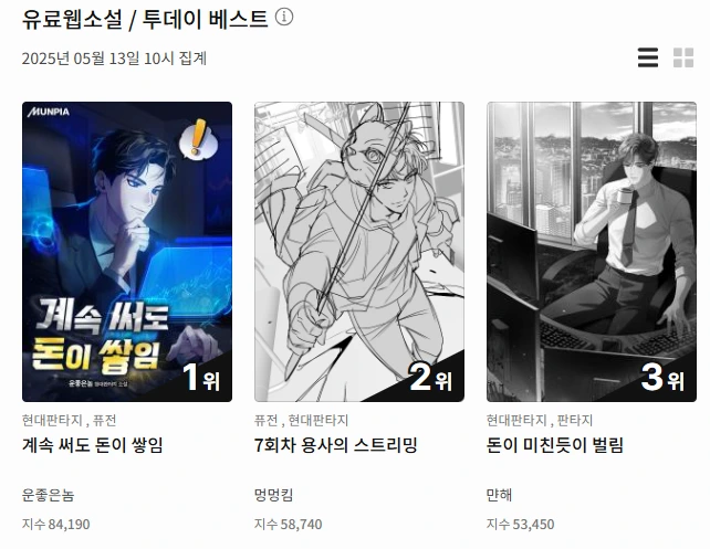 대체로 헌터물과 회사원, 투자가 엮여 있는 것을 확인할 수 있다.