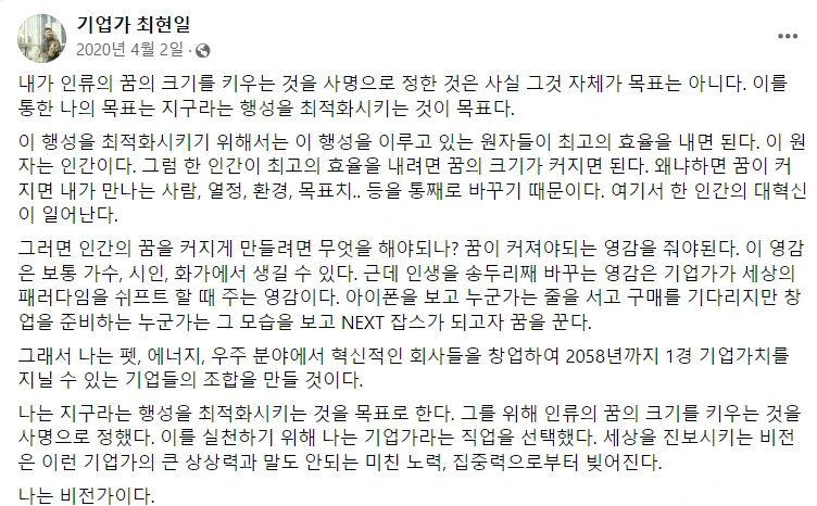 하지만 나와 전혀 다른 생각을 가진 친구도 있다. 지금은 3년 전 이 글처럼 실제로 엄청난 성장을 한 친구다. 돈도 많이 벌고, 여기저기서 투자를 받아 승승장구하는 절친이다. 이 친구는 그 누구도 범접할 수 없는 꿈을 일관성 있게 꿔왔고, 지금 그 꿈을 조금씩 이루어가고 있다. 그가 몇 년 전 쓴 이 글을 보자.