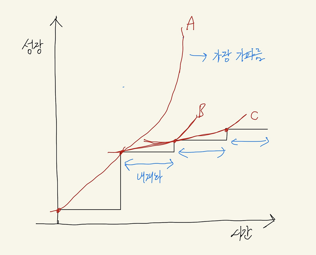 첫 번째 계단이 올라가기 제일 더디고 시간이 오래 걸린다. 대체로 A곡선을 띤다. A에서 한번 성과가 나면 B와 C는 갈수록 완만해져 성공을 이루는 것이 A보다 더 쉬워지는 것이다. 성공하기 위한 본인만의 숙련도와 스킬이 생겼거든. 다 처음이 두렵고 힘든거다.