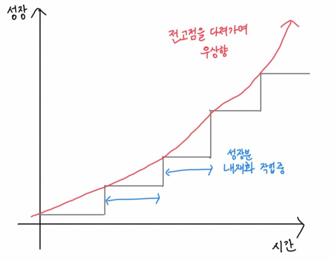 부자가 되었을 때, 성공을 했을 때 혹은 모두가 우러러보는 사람이 되었을 때를 생각해보자. 모두가 그들은예상하는 게 빨간색 그래프 포물선처럼 우상향곡선을 했을 것이라 생각하지만 실제로 파보면 파란색 그래프같은 모형을 띄고 있다. 나도 모르는 사이에 내재화 과정을 거쳐 한번에 점프하고, 또 내재화를 거치고 이런 식이다.