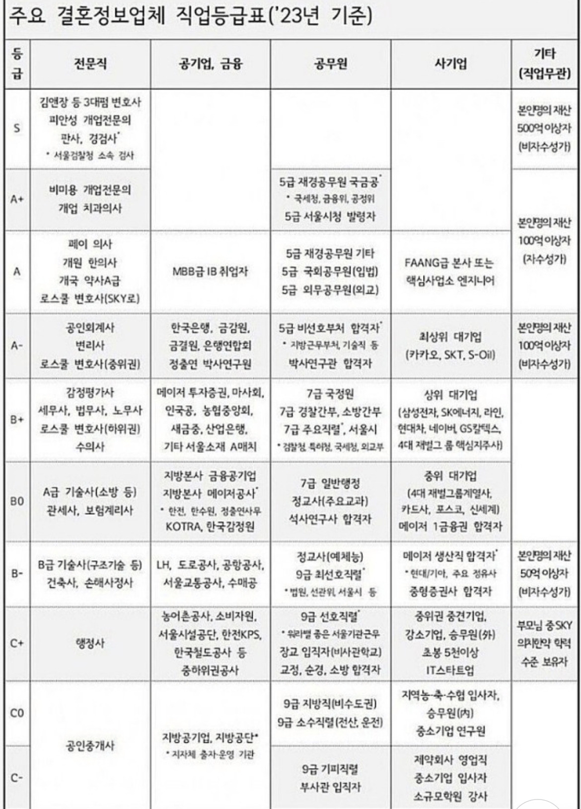 이 자료는 더하다. 심지어 올해 최신본으로, 직업에 따라 결혼시장 등급을 매긴 것이다. 우리나라 사람들은 서열 매기기에 혈안이 되어있다. 전 세계에 이런 자료는 대한민국밖에 없을 거다. 타인과의 비교 속 우월감만이 행복을 가져다준다고 믿는 편협한 사고다.