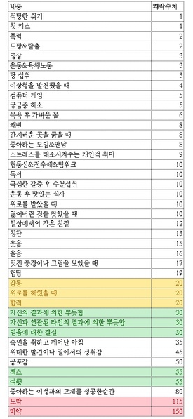 표를 보면 마약이 가장 지수가 높다. 빨간 음영 가장 지수가 높은 도박과 마약 이 둘을 제외하고, 위 모든 항목의 공통점이 있다. 이는 모두 '예측 가능한 쾌락'이라는 것이다. 저 상태가 됐을 때 우리는 우리에게 어떤 자극을 가져다주는지 얼추 안다.