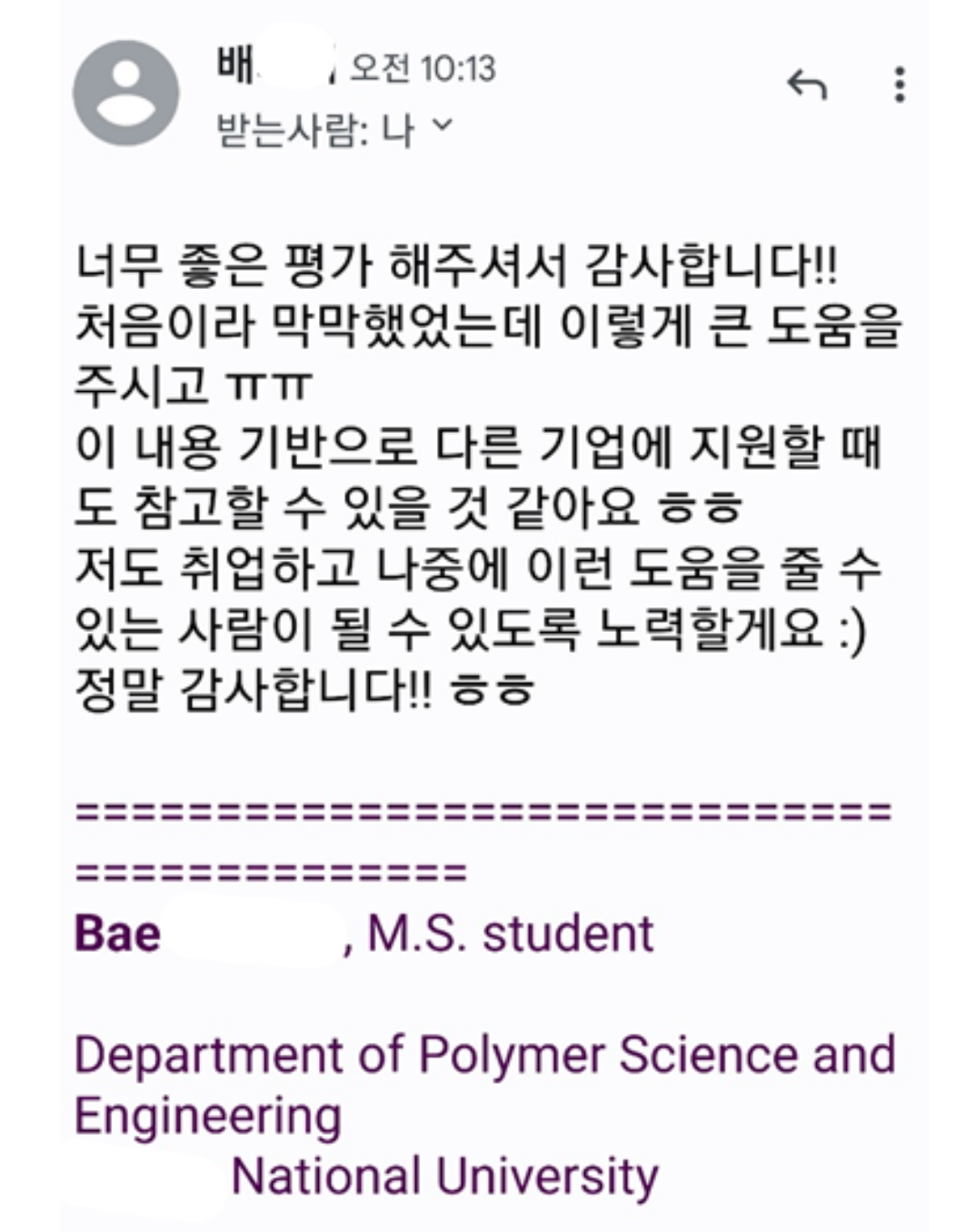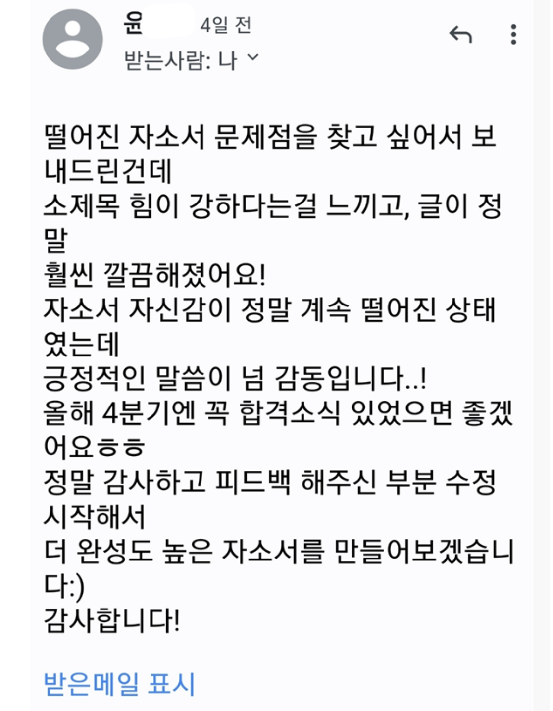 주변 취업준비생을 보면서 조금 답답했던 면들이 보였는데 생각보다 많은 사람들이 글로 자기 어필을 잘하지 못하는 거다. 나도 잘하는 것이 아니지만 최소한 글을 좋아하고, 적어도 그들보단 잘할 수 있다는 확신이 있었다. 조금씩 한두 차례 도와주다 보니 ‘나 덕분에 도움이 됐다, 취업을 할 수 있었다’며 최종합격후기 및 감사 메일이 몇 개씩 오기 시작했다.