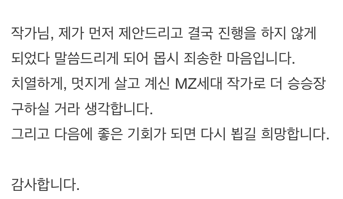 세 번째 책 출간 제의가 왔다. 모 출판사대표님이 마음에 드는 주제가 있어 제의를 해 온 것이다. 그런데 결론부터 말하면 이는 무산되었다. 책으로 낼 특정 주제에 대한 대중들의 민감 정도가 우려되어 그 회사에서 이를 반대한 기획자가 있었다고 한다. 대표님은 먼저 제안을 했는데 다시 못하게 되어 송구하다는 말과 함께 장문의 메일을 보내오셨다.
