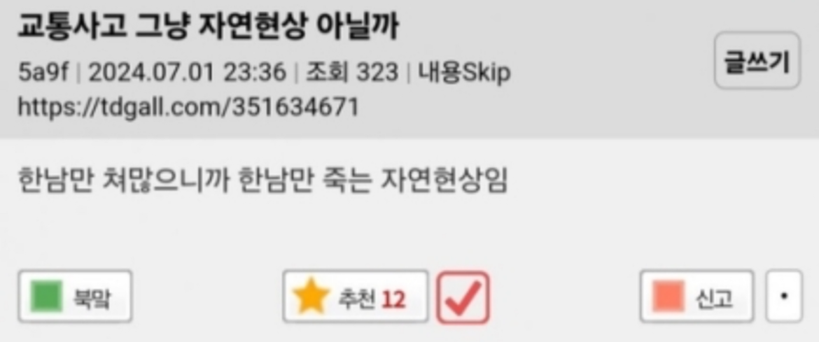 어김없이 지금도 남성혐오 사이트에는 잘 죽었다는 식의 폭언과 조롱이 쏟아진다. 한 번에 다 죽었다고 볼링장이냐고 묻는다. 자연현상이냔다. 스트라이크란다. 사람이 지금 죽었는데, 주저앉은 유가족을 앞에 두고 뚫린 입이라고 저런 입에 담을 수 없는 말들을 쏟아낸다. 주체할 수 없는 증오에 매몰된다. 글쓴이가 진정 사람인지가 의심스럽다. 실제로 내가 만약 글쓴이를 만난다면 과연 어떤 표정으로 만날지 궁금하다.