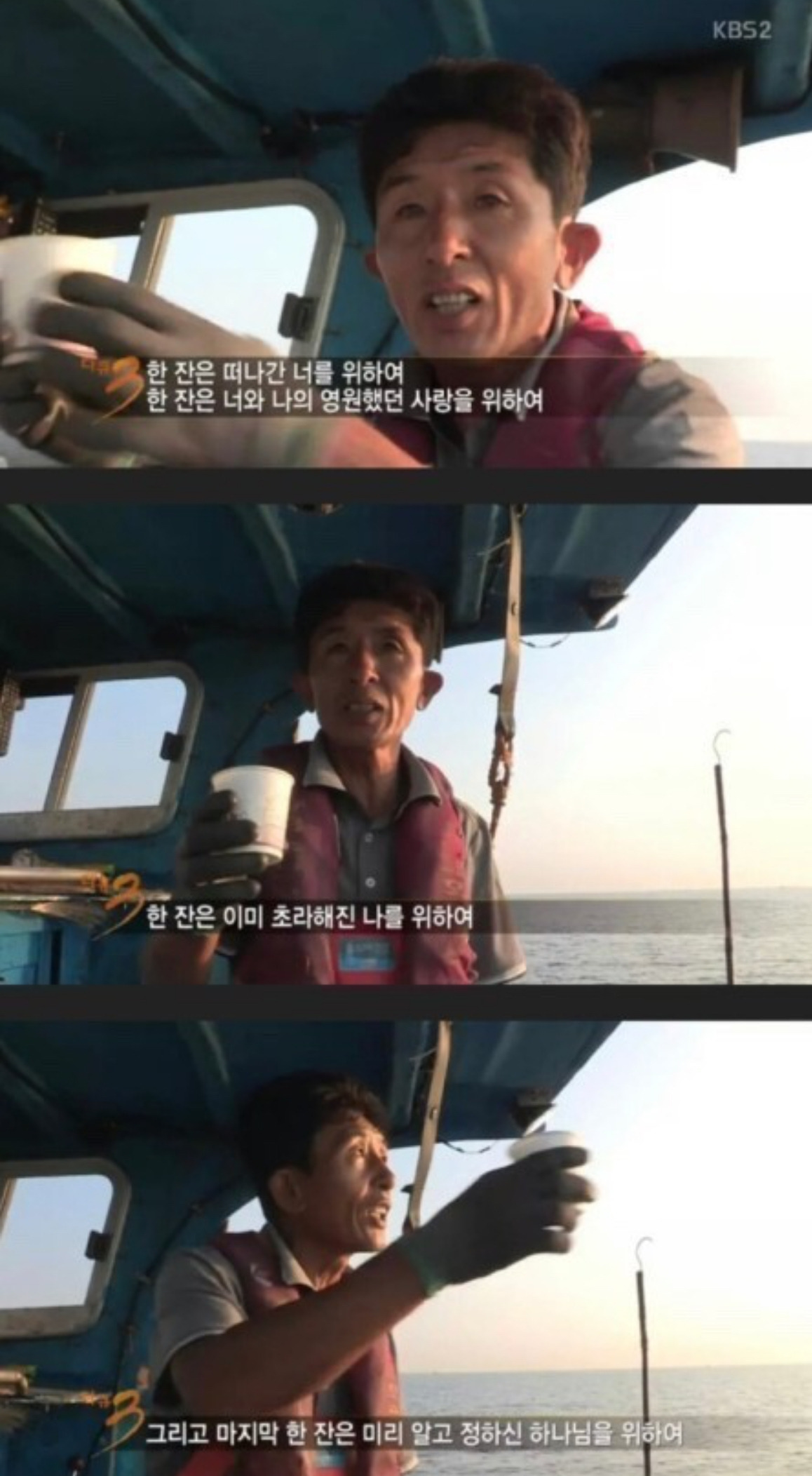 다큐멘터리 3일 레전드 짤이다. 이 낭만적인 어부 아저씨의 원래 꿈은 국문과였다. 현대인에게는 있을 수 없는 소름 돋는 감성을 가지고 계신다. 자신에게 솔직함을 항마력으로 표현하는 현대인에겐 이런 진실된 낭만 따위는 존재하지 않는다. 그야말로 가슴에 불을 지피는 장면이다. 이 분은 오래오래 충만한 감성으로 행복하실 것이다.