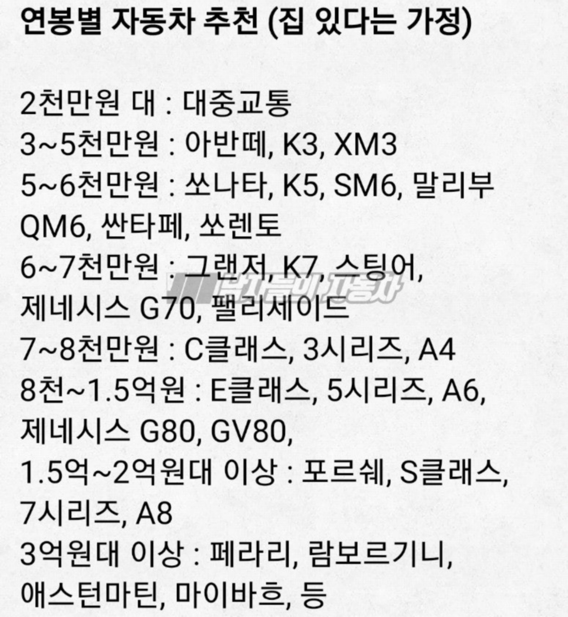 인터넷엔 이렇게 연봉별 자동차 등급표가 있다. 그나마 가장 현실적인 표라 들고 왔다. 내 기준, 꼭 필요한 사람이라면 표에서 연봉 ‘-1000만 원’을 할 것이고, 그렇지 않다고 하면 나는 칸을 하나 더 만들 것이다.