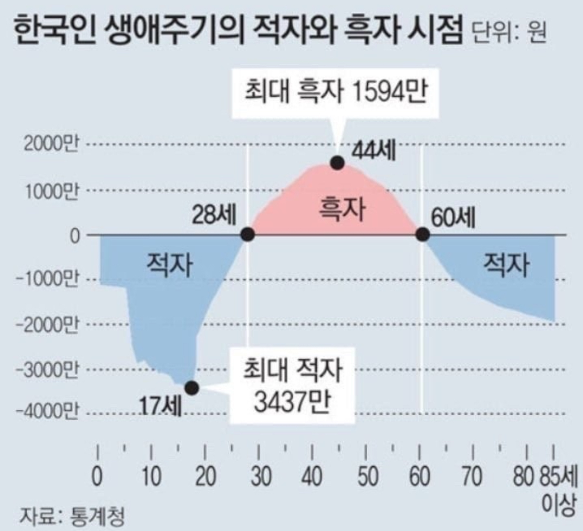 우리가 돈을 벌어 흑자를 내는 시기가 붉은색으로 나타나있다. 전체 생애주기로 보면 길지만은 않은 시간이다. 심지어 이 통계청자료는 현실과 한참 괴리가 있는 것이 요즘 청년은 취업난으로 돈을 버는 시기가 늦춰지고, 결혼 및 출산도 늦춰지기에 흑자기간은 저 자료보다도 당연히 더 짧을 수밖에 없다. 심지어 결혼은 그렇다 치고 자녀를 가지면 흑자가 아니라 적자의 삶이랑 마찬가지다. 35세부터 그냥 적자란 거다. 다 이렇게 팍팍하게 살고 있다. 재테크를 하지 않으면, 시간이라는 레버리지를 잘 사용하지 않는다면 본인이 죽을 때까지의 미래의 필요한 돈을 지금 현재와 나눠 쓰는 방식이라 생각하면 된다. 돈울 벌어도 절대 여유 있다고 생각하면 안 된다.