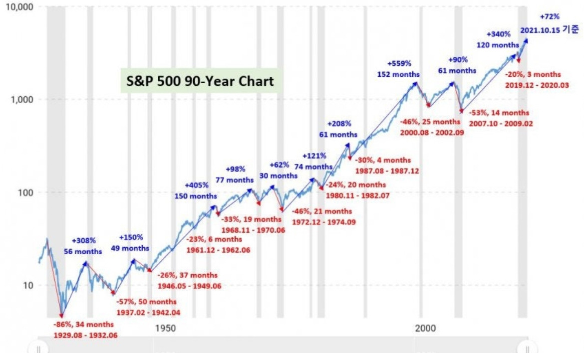 위 사진은 S&P 500 ETF 지수 90년 그래프다. 백년이 가까운 시간 동안 미국 증시는 꾸준한 우상향을 그려왔다. 재테크의 재자도 모르는 사람들에게, 주식을 어떻게 시작해야 할지 모르겠다는 사람들에게 왜 사람들이 S&P500만 꾸준히 모아도 노후자금으로 충분할 거라는 얘기를 할까. 못해도 평균 수익률 8%~10%는 가져갈 수 있다는 확신이 있기 때문이다. 이 확신은 어디서 왔냐고? 지냔 100년간의 저 그래프가 말해준다. 팩트로 따져보자는 것. 저 중간중간 밑으로 힘없이 빠진 순간들도 숱하게 존재한다. 줌인으로 하나하나 보자면 -30%의 폭락도 있었다. 이때 투자자들은 얼마나괴로웠겠나. S&P 500 지수가 아니더라도 개별종목을 가지고 있던 거의 모든 투자자들이 이때 자산이 거의 녹았을 거다. 석유파동이나, 금융위기나, 코로나나. 근데도 참았다. 참고 기다리니 결국 지금 우상향 했고, 앞으로도 더 그럴 거다. 인생을 저렇게 바라보면 된다. -30%였을 때 누군가는 그걸 절호의 기회라 여겼다. 시간이 걸리는 본인의 꾸준함은 그렇게 복리효과가 돼본인에게 돌아온다.