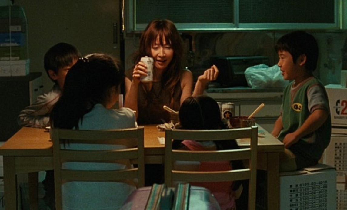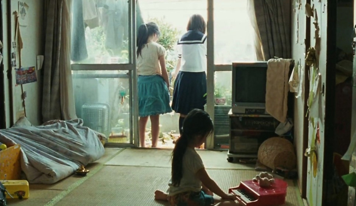 이 좁은 집에는 네 명이 산다. 영화의 시작부터 남자아이 첫째 아키라와 엄마만 살고 있다고 누구나 받아들인다. 근데 충격적 이게도 캐리어에서 갑자기 아이 둘이 나오고, 역 앞에서 아키라가 데리러 나가 새로운 한 아이와 함께 집에 들어오면서 5인가족이 마침내 완성된다. 첫 결혼에 실패하고, 유흥업소에서 일하는 엄마는 무책임하게 여럿 남자와 관계를 가지며 4명을 낳았다. 장을 봐야 한다는 특명이 있기에 첫째를 제외한 모두는 집 밖에 나가지 못한다. 엄마는 마침내 간간히 돈을 보내다 크리스마스가 지나고 집에 오지 않는다. 새로운 남자를 찾아, 돈을 찾아 무책임하게 떠난 것이다. 간간히 아키라에게 보낸 두어 번의 돈은(5만 엔) 그녀의 일말의 죄책감일 뿐이다.