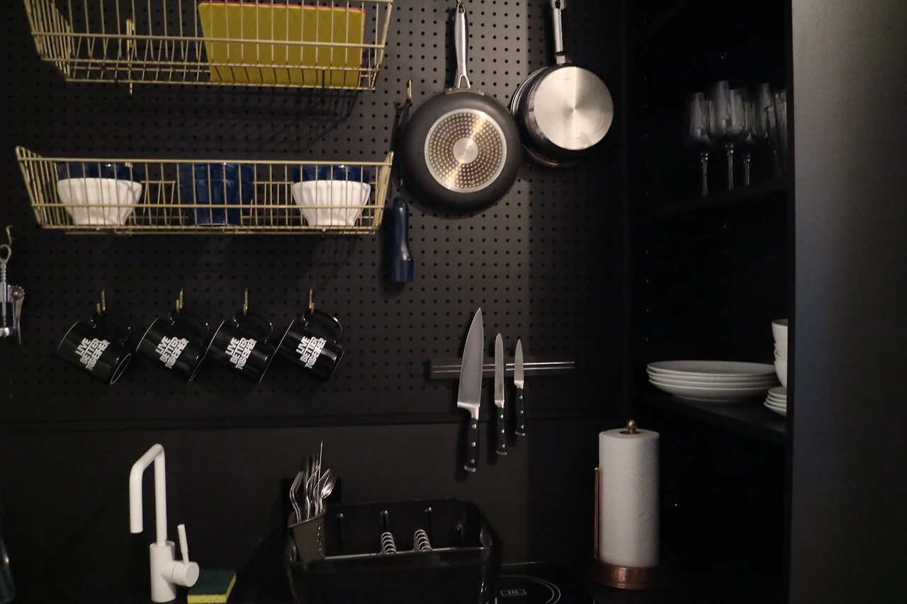 가장 인상적이었던 부엌의 보드. 요즘 유행(?)하고 있는 스타일이다. 필요한 식기와 조리도구들이 모두 구비되어 입주 시 새로 살 필요가 없어보인다.