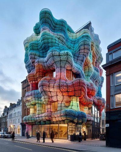 다른 분야의 디자이너를 초청하여 건축 디자인을 시키는 것도 가능하다. 세련된 느낌의 GUI 디자인으로 유명한 디자이너 Leo Natsume의 스타일로 건물을 디자인해 보라고 하면 다음과 같은 느낌의 결과물을 얻을 수 있다. 생성 AI는 이처럼 시공간을 초월하여 전 세계의 유명 디자이너들을 초청하여 협업할 수 있는 기회를 우리에게 열어 주었다.