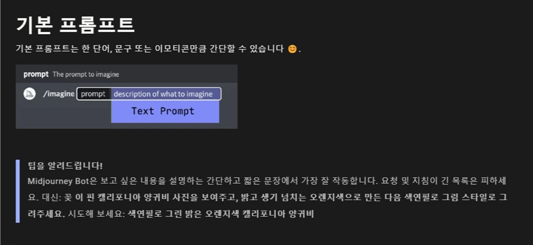 미드저니에 프롬프트를 입력할 때 가장 기본적인 팁은 키워드를 주로 활용하는 것입니다. 문장을 쓰기 보다는 단어를 나열하는 것이 더 좋은 결과를 얻을 수 있습니다. 예를 들어, "꽃이 핀 캘리포니아 양귀비 사진을 보여주고, 밝고 생기 넘치는 오랜지 색으로 만든 다음 색연필료 그린 스타일로 그려주세요."와 같이 문장 보다는 " 색연필로 그린 밝은 오랜지색 캘리포니아 양귀비"와 같이 단어 나열적인 표기 방식이 도움이 됩니다.