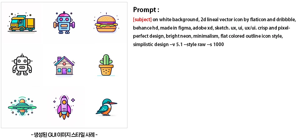 예를 들어, "화이트 배경에 플랫 컬러 아웃라인 스타일의 [로봇] 아이콘을 만들어줘"와 같은 입력을 해주고, 로봇이라는 단어를 [새]로 바꾸거나, 다양한 단어를 넣어주면 같은 프롬프트로 단어만 바꿔서 다양한 아이콘을 생성해낼 수 있습니다.
